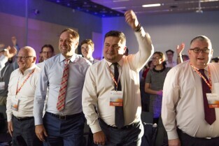 Gdańsk, Amber Expo. Międzynarodowy Kongres Smart Metropolia. Gimnastyka zorganizowana przez Ministra Sportu i Turystyki Adama Korola podczas jego wystąpienia. Nz. od prawej: Wiceprezes Międzynarodowych Targów Gdańskich Maciej Glamowski, Z-ca Prezydenta Gdańska Piotr Kowalczuk, Podsekretarz Stanu w Ministerstwie Rozwoju Regionalnego Paweł Orłowski, Marszałek Woj. Pomorskiego Mieczysław Struk, Z-ca Prezydenta Gdańska Wiesław Bielawski