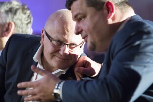 Gdańsk, Amber Expo. Międzynarodowy Kongres Smart Metropolia. Gimnastyka zorganizowana przez Ministra Sportu i Turystyki Adama Korola podczas jego wystąpienia. Nz. Podsekretarz Stanu w Ministerstwie Rozwoju Regionalnego Paweł Orłowski, po lewej Marszałek Woj. Pomorskiego Mieczysław Struk