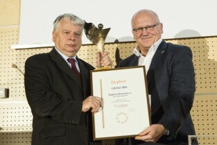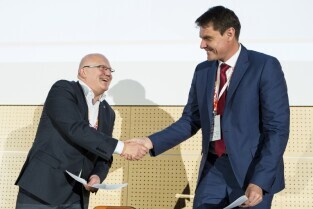 Gdańsk, Amber Expo. Międzynarodowy Kongres Smart Metropolia. Nz. dyplom Grand Prix za działania na rzecz innowacyjności i Smart Metropolii dla Marszałka Senatu RP Bogdana Borusewicza, który wręcza Z-ca Prezydenta Gdańska Wiesław Bielawski