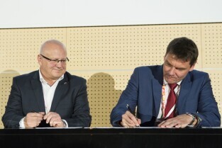 Gdańsk, Amber Expo. Międzynarodowy Kongres Smart Metropolia. Minister Sportu i Turystyki Adam Korol i Z-ca Prezydenta Gdańska Wiesław Bielawski podpisują umowę na dofinansowanie budowy stadionu lekkoatletycznego GOKF przy al. Grunwaldzkiej w Gdańsku