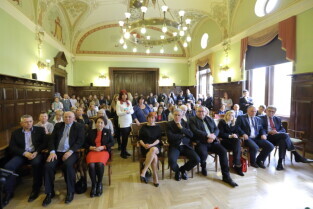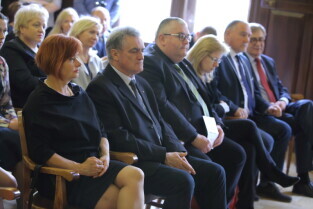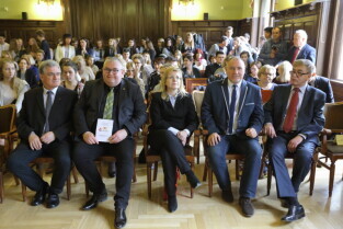 Gdańsk. Uroczystość wręczenia nagród laureatom XVIII Gdańskiej Edycji Konkursu „Ośmiu Wspaniałych”. Nz. Przewodniczący Rady Miasta Bogdan Oleszek, Wiceprezydent Gdańska Piotr Kowalczuk, Prof. Anna Machnikowska, Radny Piotr Gierszewski i Zbigniew Strzelczyk-Prezes Krajowej Izby Gospodarczej.