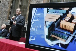 Ogłoszenie wyników konkursu architektonicznego na zagospodarowanie północnego cypla Wyspy Spichrzów. Gdańsk, Ratusz Głównomiejski. Nz. Prezydent Gdańska Paweł Adamowicz