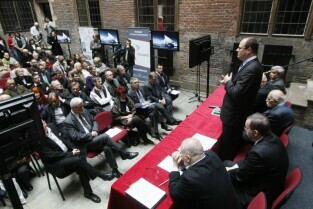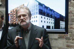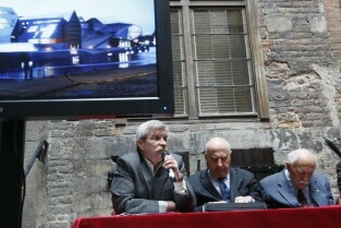 Ogłoszenie wyników konkursu architektonicznego na zagospodarowanie północnego cypla Wyspy Spichrzów. Gdańsk, Ratusz Głównomiejski. Nz. zwycięzca nagrody Zbigniew Pomaz wiceprezes pracowni MAT Sp. z o.o.