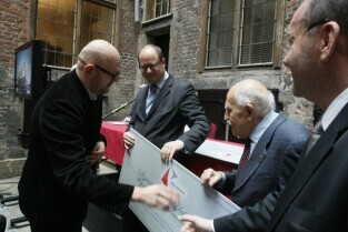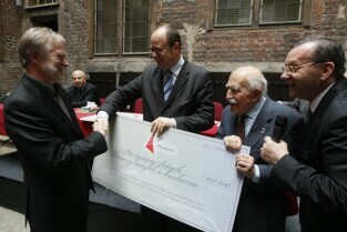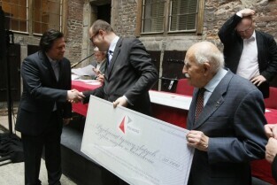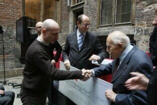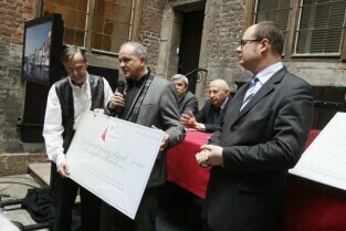 Ogłoszenie wyników konkursu architektonicznego na zagospodarowanie północnego cypla Wyspy Spichrzów. Gdańsk, Ratusz Głównomiejski. Nz. głóną nagrodę odbiera Zbigniew Pomaz wiceprezes pracowni MAT Sp. z o.o.