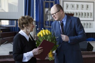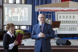 I LO w Gdańsku. Konkurs recytatorski poświęcony Jackowi Kaczmarskiemu. Nz. Prezydent Gdańska Paweł Adamowicz wręcza okolicznościową nagrodę, którą otrzymuje pani Wanda Szafran