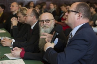Gdańsk Wrzeszcz. III Liceum Ogólnokształcące. Finał Międzyszkolnego Konkursu Żywego Słowa. Nz. Jury Konkursu, od lewej: Dyrektor III LO Bożena Ordak, Sędzia Sądu Apelacyjnego w Gdańsku Artur Lesiak, Mieczysław Abramowicz, Prezydent Gdańska Paweł Adamowicz