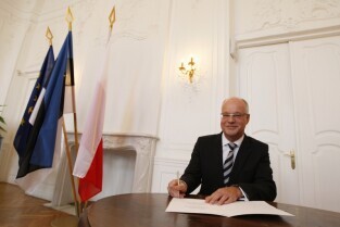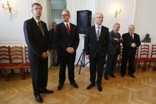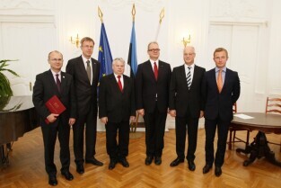 Gdańsk Oliwa, Pałac Opatów. Uroczystość inauguracji działalności Konsulatu Honorowego Estonii w Gdańsku. Pierwszym w powojennej historii miasta Konsulem Honorowym Estonii został Tomasz Posadzki. Nz. od lewej: Z-ca Prezydenta Gdańska Maciej Lisicki, Ambasador Estonii w Polsce Taavi Toom, Marszałek Senatu RP Bogdan Borusewicz, Wiceminister MSZ Estonii Lauri Bambus, Konsul Honorowy Estonii Tomasz Posadzki, Wicemarszalek Woj. Pomorskiego Ryszard Świlski