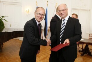 Gdańsk Oliwa, Pałac Opatów. Uroczystość inauguracji działalności Konsulatu Honorowego Estonii w Gdańsku. Pierwszym w powojennej historii miasta Konsulem Honorowym Estonii został Tomasz Posadzki. Nz. po lewej Wiceminister MSZ Estonii Lauri Bambus, po prawej Konsul Honorowy Estonii Tomasz Posadzki
