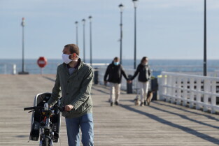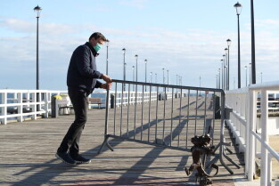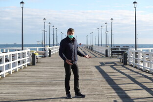 Gdańsk. Koronawirus. Od dziś można wejść do parku, lasu, na plażę - znika część ograniczeń. Nz. Adam Korol, dyrektor Biura Prezydenta ds. sportu otwiera molo w Brzeźnie.
