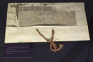 Król jedzie! Wernisaż wystawy "Wizyty władców polskich w Gdańsku w XV-XVIII w.". Gdańsk, Ratusz Głównego Miasta.Nz. przywilej króla Kazimierza IV Jagiellończyka dla Gdańska z 25 maja 1457 r.