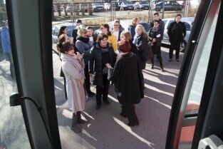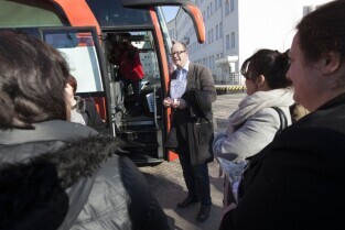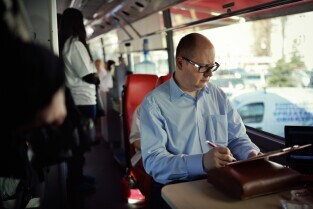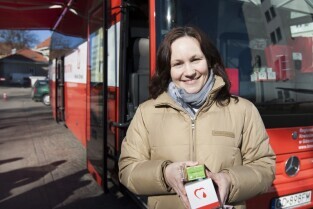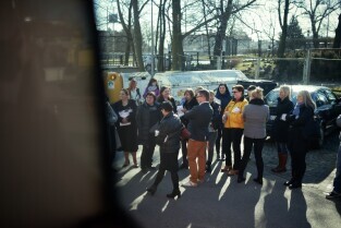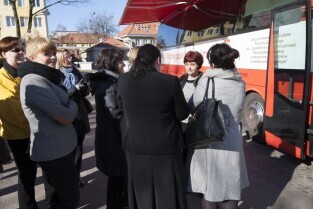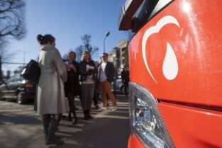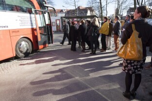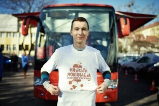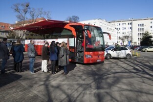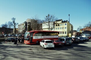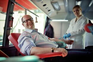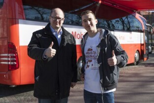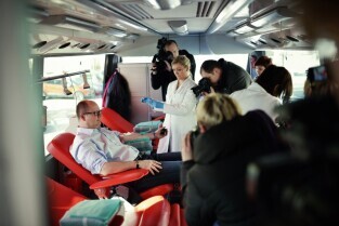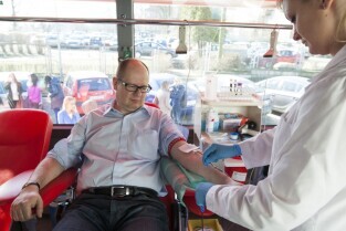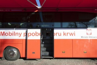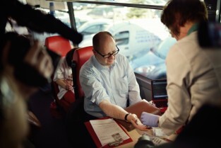 Parking przed Urzędem Miejskim w Gdańsku. Prezydent Gdańska Paweł Adamowicz oraz pracownicy urzędu oddają krew w podstawionym autobusie, tym samym uczestnicząc w akcji „Krwista Nominacja” wymyślonej przez Dominika Karbowskiego - studenta Politechniki Gdańskiej