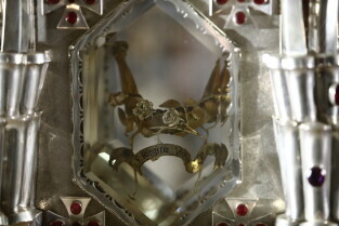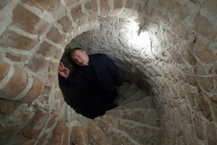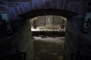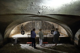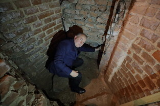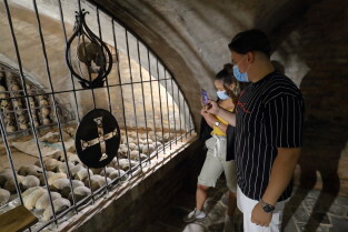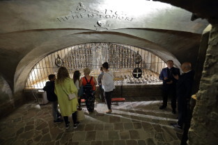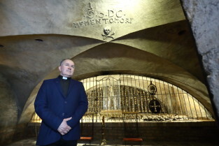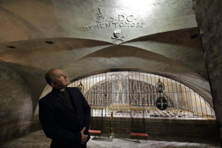 Gdańsk, Bazylika pw. św. Brygidy. Krypta Św. Brygidy, tzw. „krypta czaszek”. Nz. Ks. Ludwik Kowalski, proboszcz Bazyliki pw. św. Brygidy.