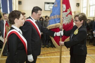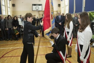Gdańsk Strzyża. Nadanie imienia Krzysztofa Kolbergera IX Liceum Ogólnokształcącemu w Gdańsku. Nz. Dyrektor IX LO Hanna Konczakowska-Makulec odbiera nowy sztandar od Rady Rodziców