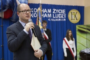 Gdańsk Strzyża. Nadanie imienia Krzysztofa Kolbergera IX Liceum Ogólnokształcącemu w Gdańsku. Nz. Prezydent Gdańska Paweł Adamowicz