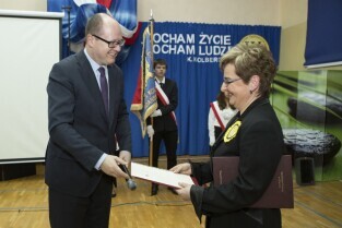Gdańsk Strzyża. Nadanie imienia Krzysztofa Kolbergera IX Liceum Ogólnokształcącemu w Gdańsku. Nz. Dyrektor IX LO Hanna Konczakowska-Makulec i Prezydent Gdańska Paweł Adamowicz