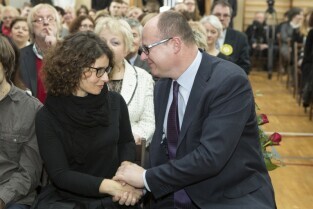 Gdańsk Strzyża. Nadanie imienia Krzysztofa Kolbergera IX Liceum Ogólnokształcącemu w Gdańsku. Nz. córka patrona szkoły Julia Kolberger i Prezydent Gdańska Paweł Adamowicz