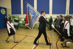 Gdańsk Strzyża. Nadanie imienia Krzysztofa Kolbergera IX Liceum Ogólnokształcącemu w Gdańsku. Nz. Dyrektor IX LO Hanna Konczakowska-Makulec przekazuje uczniom nowy sztandar