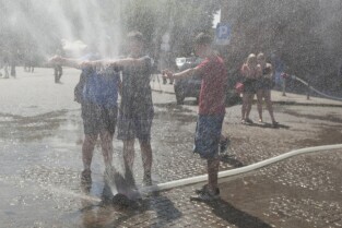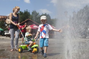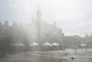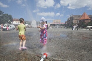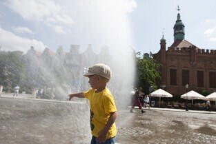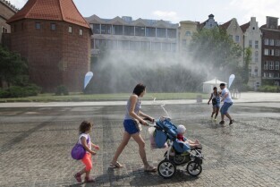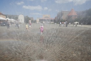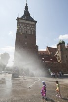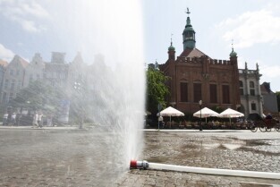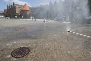 Targu Węglowy w Gdańsku. Inauguracja działania kurtyn wodnych, które będą uruchamiane w trakcie letnich upalnych dni.