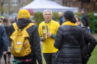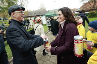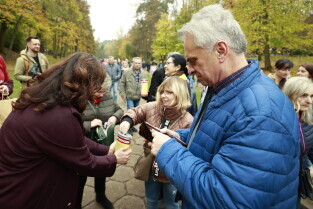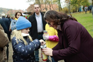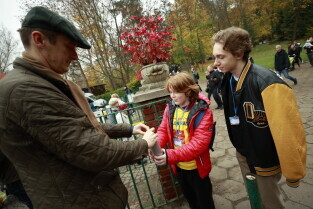 Gdańsk. Z okazji Święta Zmarłych tłumy ludzi odwiedziły groby bliskich na Cmentarzu Centralnym Srebrzysko. Nz. Radny Andrzej Kowalczys pomaga w zbiórce pieniędzy na rzecz Hospicjum im. ks. Dutkiewicza.