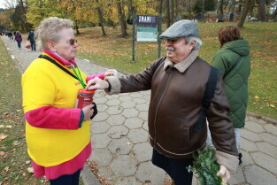 Gdańsk. Kwesta na rzecz Hospicjum im. ks. E. Dutkiewicza SAC na gdańskich cmentarzach. Nz. Na Cmentarzu Garnizonowym kwestowała Radna Anna Golędzinowska.