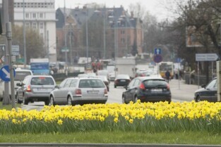 Gdańsk, skrzyżowanie przy Zieleniaku. Miejskie rabaty z kwiatami