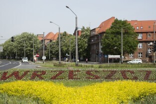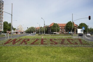 Napis "Wrzeszcz" utworzony obsadzonymi kwiatami na Placu ks. Komorowskiego w Gdańsku Wrzeszczu