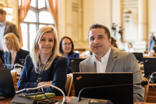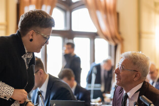 Gdańsk, ul. Wały Jagiellońskie. LXXVI sesji Rady Miasta Gdańska. Nz. radna Emilia Lodzińska i radny Przemysław Ryś
