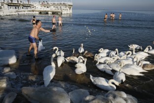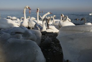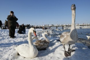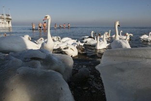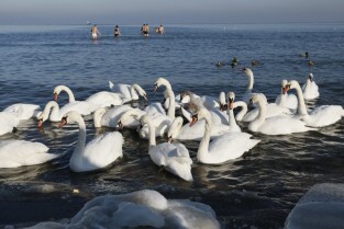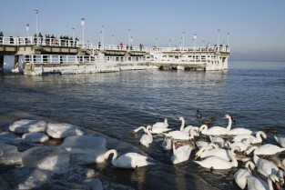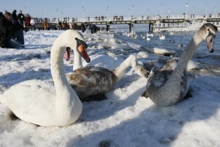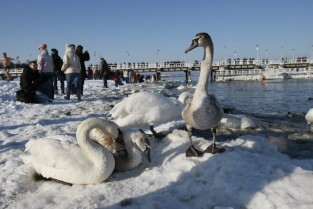 Gdańsk, łabędzie na plaży w Brzeźnie.