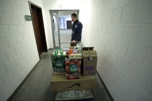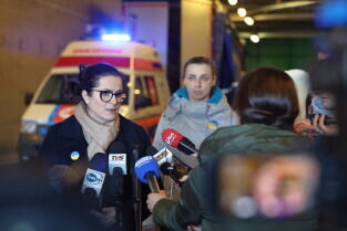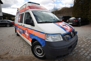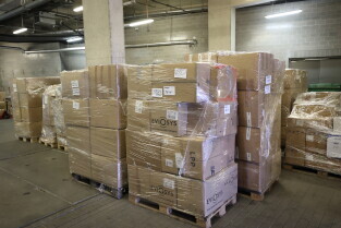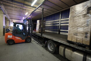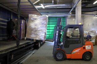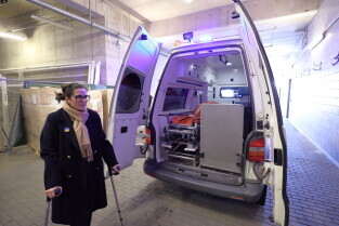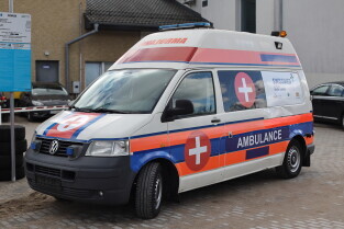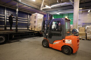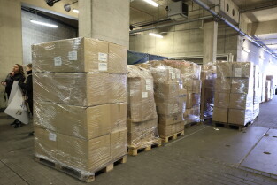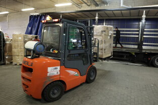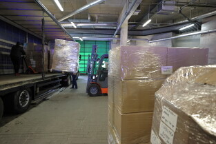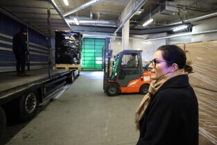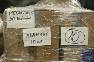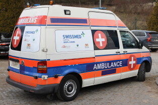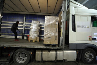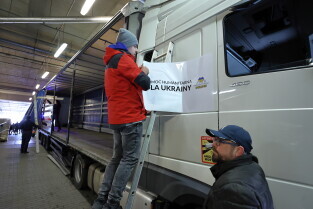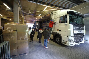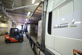 Ładowanie konwoju humanitarnego na Ukrainę, karetka dla Lwowa.