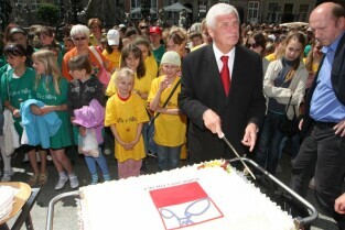 Spotkanie młodzieży Polonii z dawnych Kresów Wschodnich w Gdańsku, organizowane przez Stowarzyszenie "Wspólnota Polska". Gdańsk, Długi Targ. Nz. Marszałek Województwa Pomorskiego Jan Kozłowski