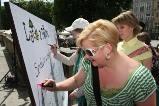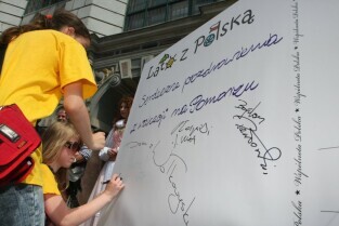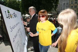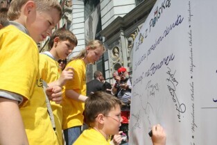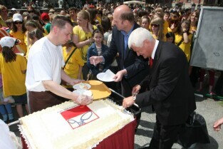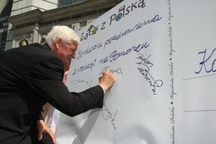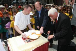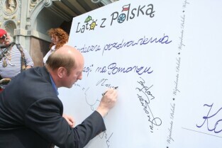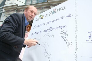 Spotkanie młodzieży Polonii z dawnych Kresów Wschodnich w Gdańsku, organizowane przez Stowarzyszenie "Wspólnota Polska". Gdańsk, Długi Targ. Nz. poseł RP i Prezes "Wspólnoty Polskiej" Maciej Płażyński i Marszałek Województwa Pomorskiego Jan Kozłowski