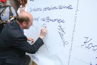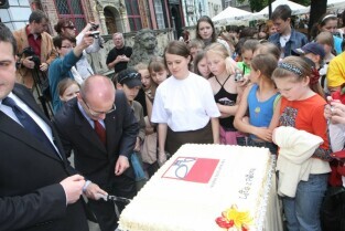 Spotkanie młodzieży Polonii z dawnych Kresów Wschodnich w Gdańsku, organizowane przez Stowarzyszenie "Wspólnota Polska". Gdańsk, Długi Targ. Nz. Wiceprezydent Gdańska Maciej Lisicki