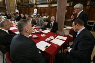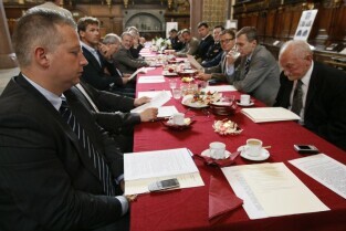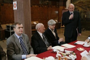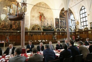 Inaugurującyjne posiedzenie "Ław Morskiej", podczas której debatowano o sprawach morskich. Gdańsk, Dwór Artusa