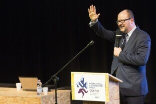 Gdańsk, Europejskie Centrum Solidarności. Lech Wałęsa występuje z przemówieniem podczas Międzynarodowego Forum Liderów Skautowych 2016. Nz. Prezydent Gdańska Paweł Adamowicz