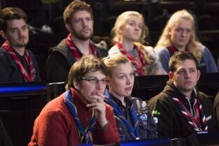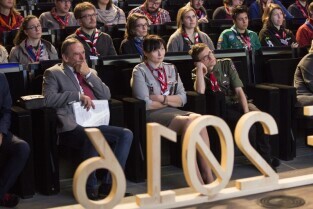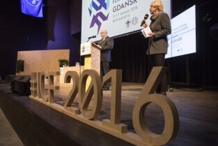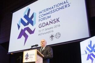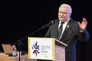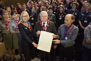 Gdańsk, Europejskie Centrum Solidarności. Lech Wałęsa występuje z przemówieniem podczas Międzynarodowego Forum Liderów Skautowych 2016. Nz. po prawej Przewodniczący Światowego Komitetu Skautowego João Armando Gonçalves, po środku Lech Wałęsa ze swoim Apelem o zawieszenie konfliktów zbrojnych w 2016 r., w którym to odbędzie się Olimpiada i Mistrzostwa Europy w Piłce Nożnej
