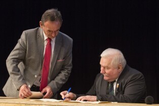 Gdańsk, Europejskie Centrum Solidarności. Lech Wałęsa występuje z przemówieniem podczas Międzynarodowego Forum Liderów Skautowych 2016. Nz. po lewej Prezes Fundacji Lecha Wałęsy Mieczysław Wachowski. Nz. Lech Wałęsa podpisuje Apel o zawieszenie konfliktów zbrojnych w 2016 r., w którym to odbędzie się Olimpiada i Mistrzostwa Europy w Piłce Nożnej
