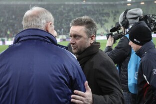 Inauguracja rundy jesiennej sezonu 2014/2015. Lechia Gdańsk wygrała na PGE Arenie z Wisłą Kraków 1:0. Mecz obejrzało ponad 14 tysięcy widzów. Nz. trener Lechii Jerzy Brzęczek.