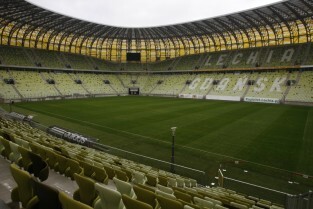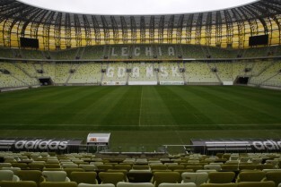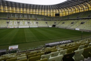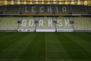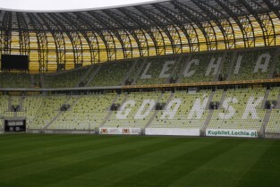 Stadion PGE Arena w Gdańsku Letnicy. Napis z nazwą klubu piłkarskiego "Lechia Gdańsk" ułożony z pomalowanych na biało krzesełek.
