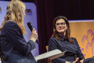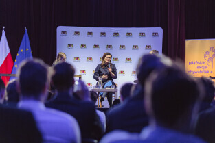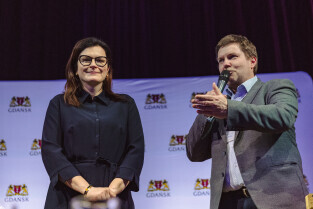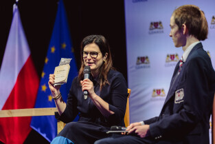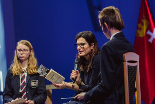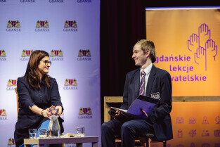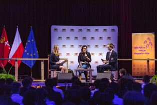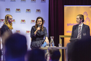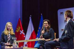 Gdańsk, ul. Podwale Staromiejskie. Lekcja Obywatelska w Zespole Szkół Łączności z udziałem Prezydent miasta Aleksandry Dulkiewicz