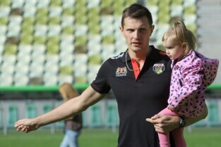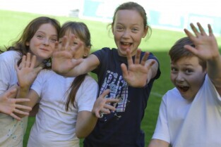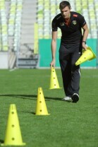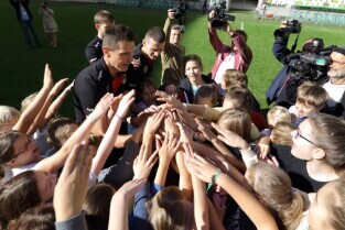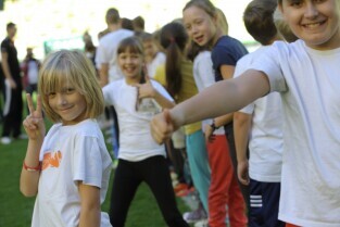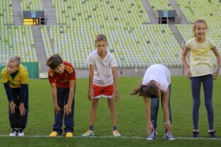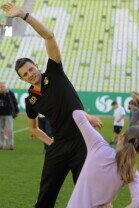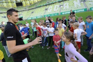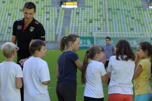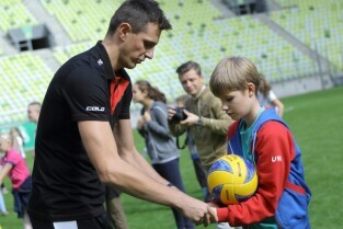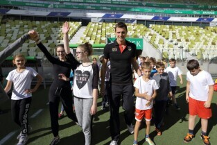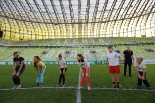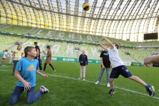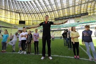 Stadion PGE Arena Gdańsk. Lekcja z cyklu „WF z Mistrzem”. Lekcję dla uczniów dwóch szkół podstawowych poprowadził Wojciech Grzyb z Lotosu Trefla Gdańsk.