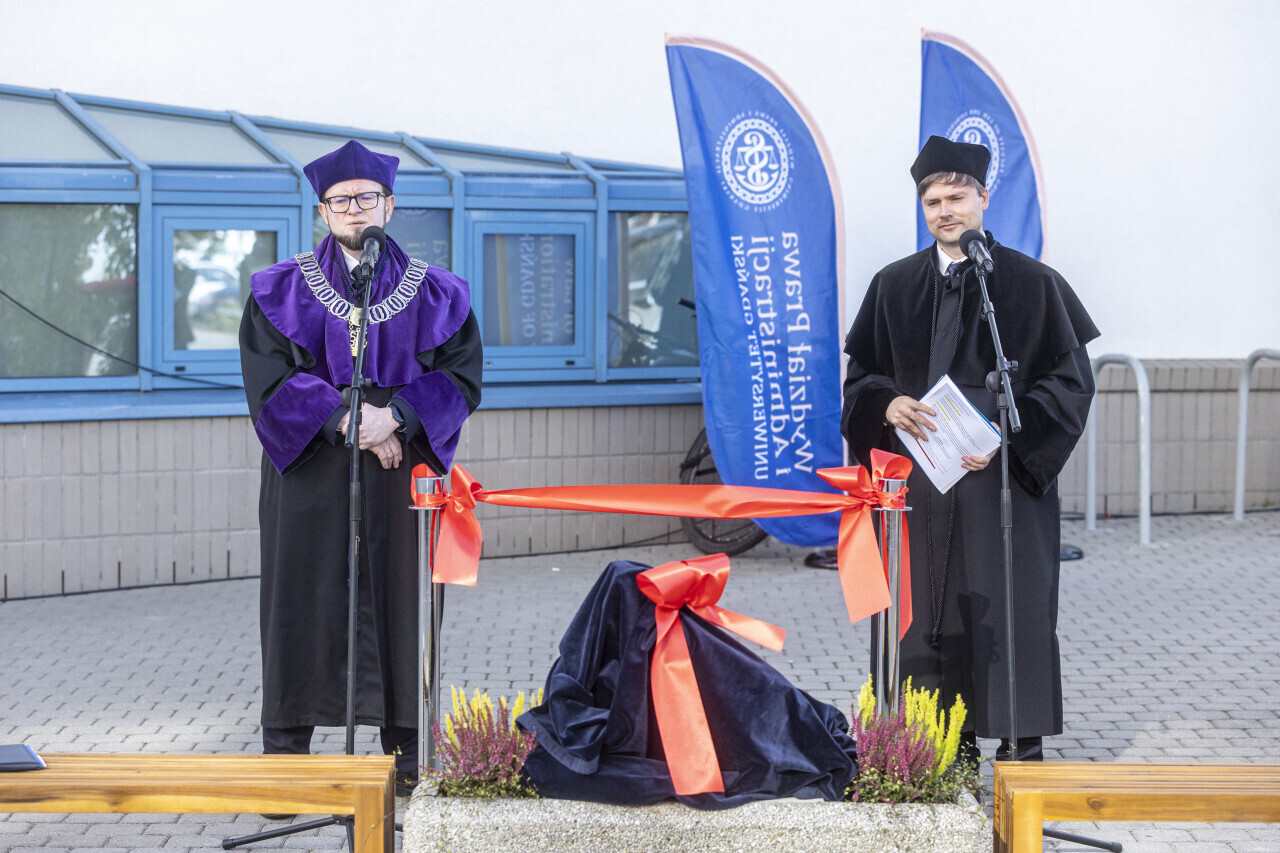 Gdańsk. Przed gmachem Wydziału Prawa i Administracji Uniwersytetu Gdańskiego odbyło się uroczyste odsłonięcie kolejnej figurki lwa Heweliona. Tym razem Hewelion wcielił się w rolę prawnika