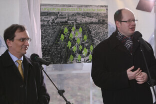 Uroczystość zamknięcia Oczyszczalni Ścieków Gdańsk Zaspa. Nz. po lewej Jacek Skarbek Prezes GIWK Sp. z o.o., po prawej Paweł Adamowicz Prezydent Gdańska