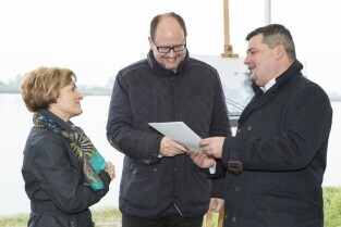 Gdańsk Sobieszewo. Podpisanie listu intencyjnego w sprawie współpracy przy projekcie pozyskania środków i budowy mostu zwodzonego w Sobieszewie. Nz. od lewej: Wójt Gminy Pruszcz Gdański Magdalena Kołodziejczak, Prezydent Gdańska Paweł Adamowicz, Podsekretarz Stanu w Ministerstwie Rozwoju Regionalnego Paweł Orłowski