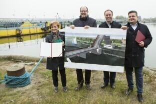 Gdańsk Sobieszewo. Podpisanie listu intencyjnego w sprawie współpracy przy projekcie pozyskania środków i budowy mostu zwodzonego w Sobieszewie. Nz. od lewej: Wójt Gminy Pruszcz Gdański Magdalena Kołodziejczak, Prezydent Gdańska Paweł Adamowicz, Marszałek Woj. Pomorskiego Mieczysław Struk, Podsekretarz Stanu w Ministerstwie Rozwoju Regionalnego Paweł Orłowski