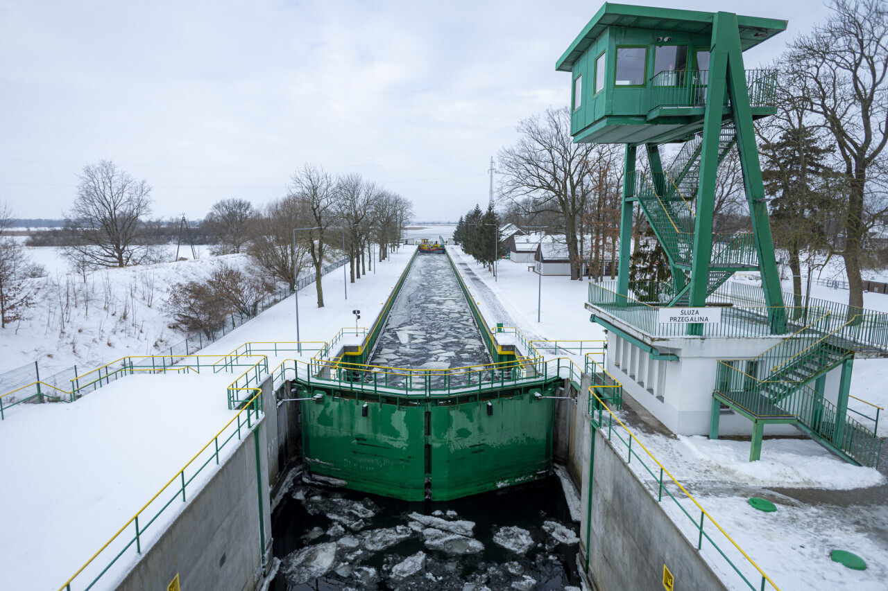 Gdańsk. Lodołamacze udrożniają zamarzniętą Wisłę w okolicy przystani promowej w Świbnie i śluzy w Przegalinie