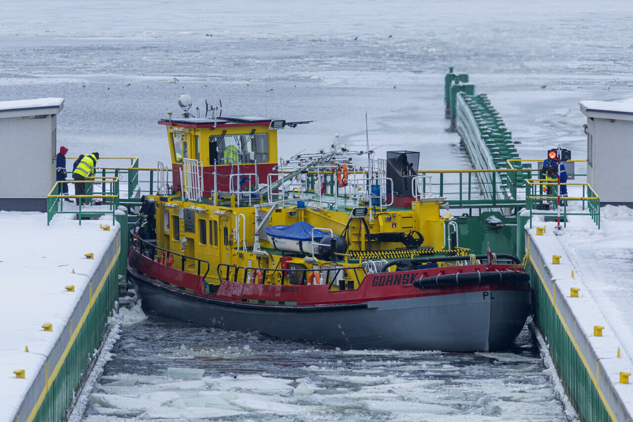 Gdańsk. Lodołamacze udrożniają zamarzniętą Wisłę w okolicy przystani promowej w Świbnie i śluzy w Przegalinie