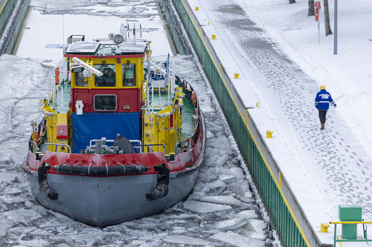 Gdańsk. Lodołamacze udrożniają zamarzniętą Wisłę w okolicy przystani promowej w Świbnie i śluzy w Przegalinie