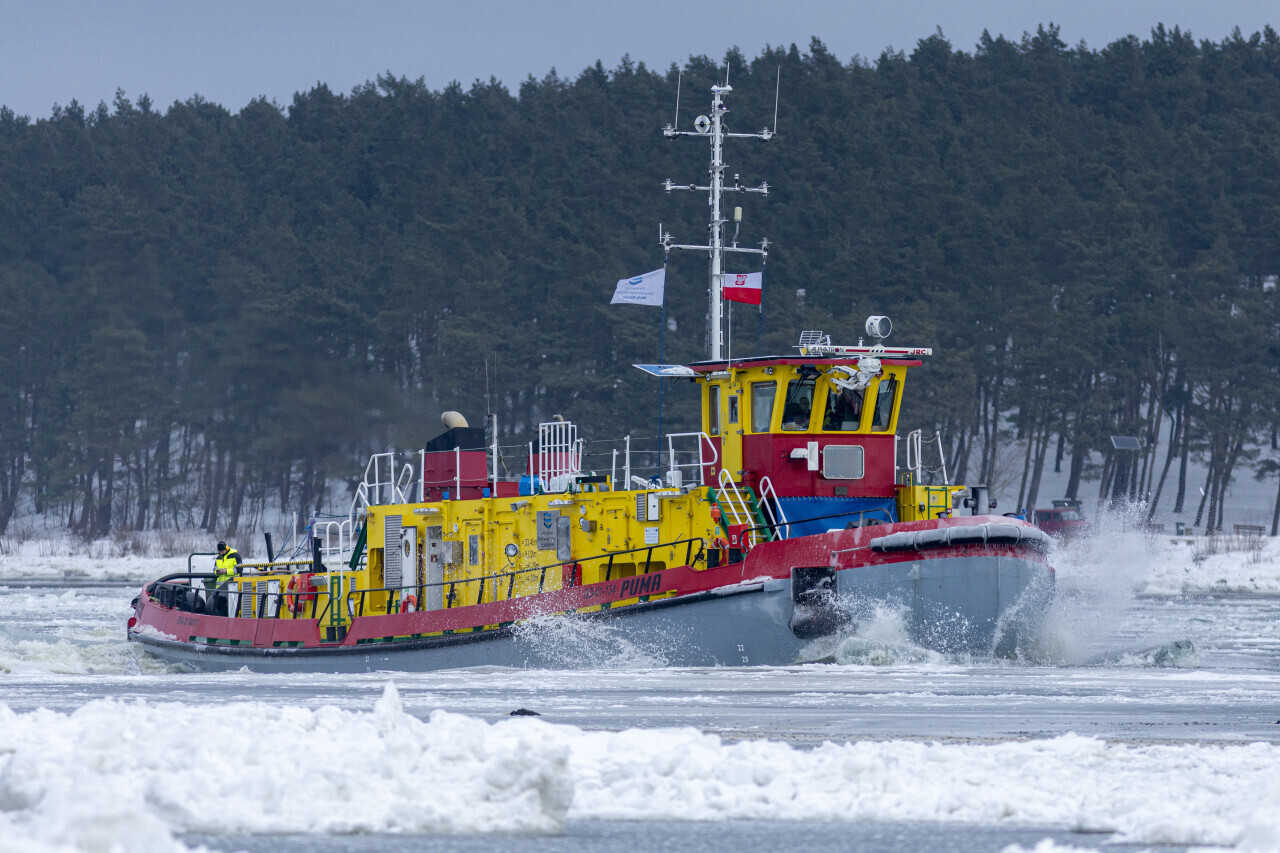 Gdańsk. Lodołamacze udrożniają zamarzniętą Wisłę w okolicy przystani promowej w Świbnie i śluzy w Przegalinie