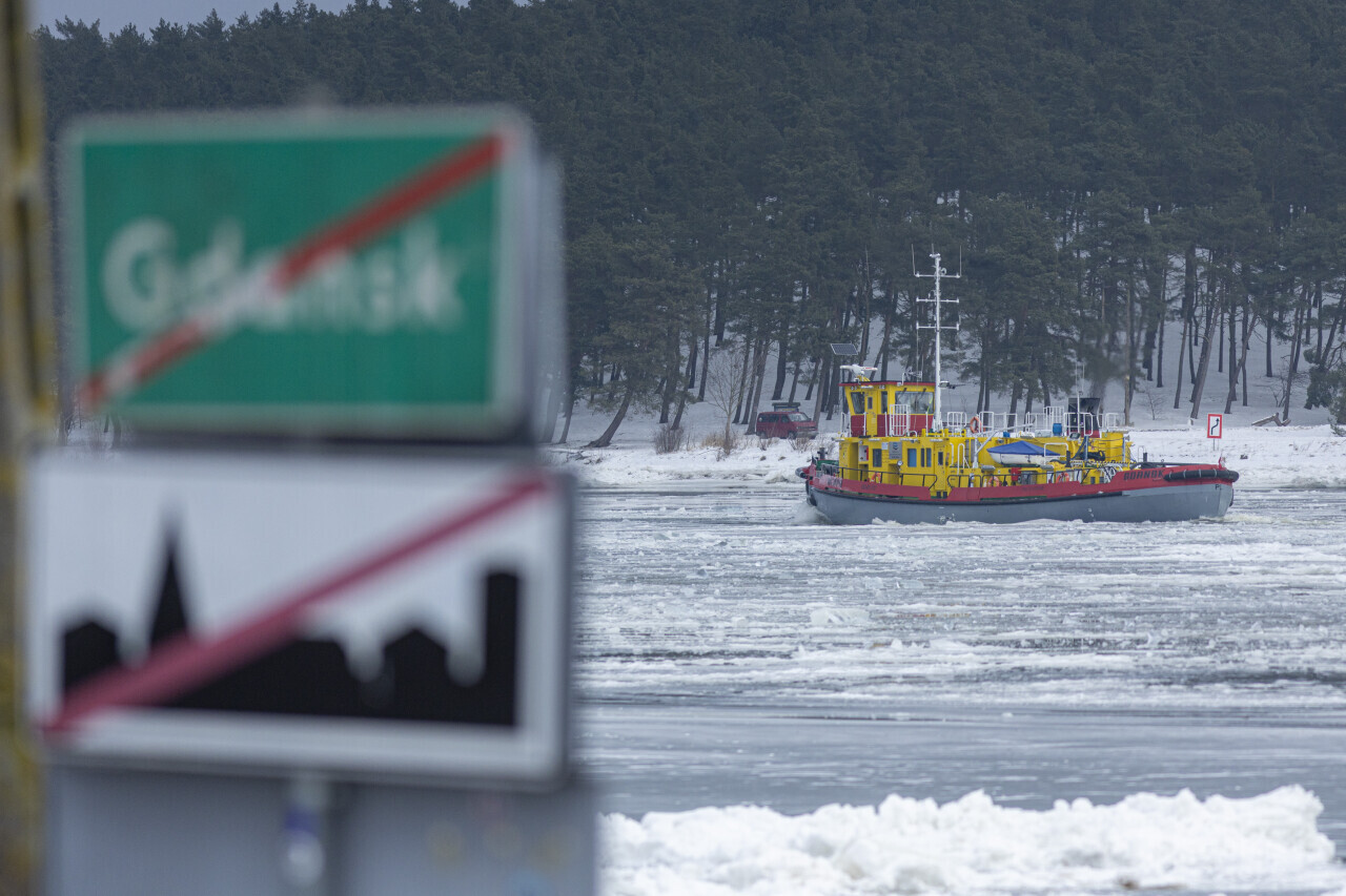 Gdańsk. Lodołamacze udrożniają zamarzniętą Wisłę w okolicy przystani promowej w Świbnie i śluzy w Przegalinie