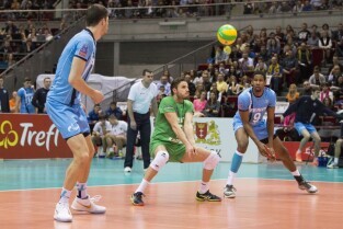 Lotos Trefl Gdańsk - Zenit Kazań. 2016 CEV DenizBank Volleyball Champions League. Ergo Arena. Gdańsk, Sopot. Nz. z piłką Wojciech Grzyb, po lewej Sebastian Schwarz, z tyłu Piotr Gacek